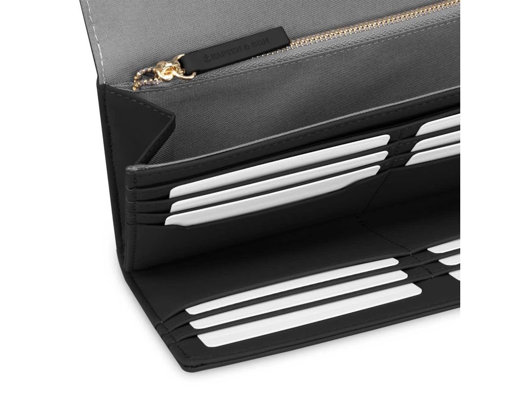 Vaše nová oblíbená peněženka v elegantní černé barvě nabízí úložný prostor pro až 12 karet, obsahuje oddíl na hotovost a telefon najde zde bezpečné místo. Občanský průkaz, řidičský průkaz, kreditní karty a další - s touto peněženkou si všechno rychle uschováte a vždy máte vše po ruce. Otevírá a zavírá se pomocí magnetického závěru. Oddíl na hotovost je vybaven zipem a uvnitř najdeš rozdělení pro oddělení bankovek od mincí. Doplněk, který tě bude spolehlivě provázet dlouhou dobu.
